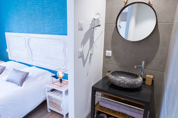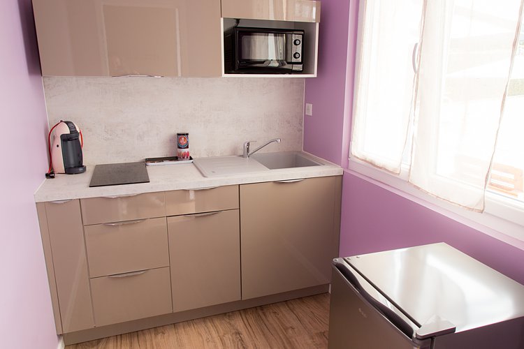 Une chambre avec salle de douche et une kitchenette équipée permettent à deux hôtes de profiter d'une intimité.